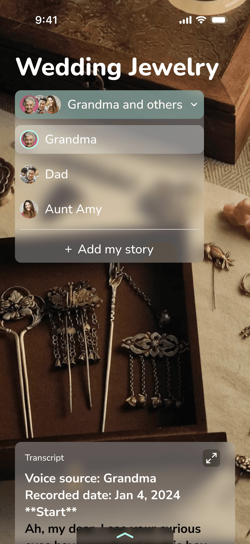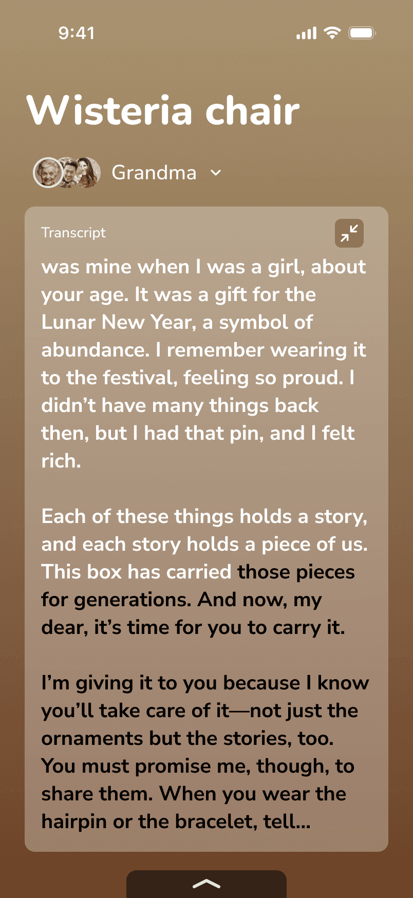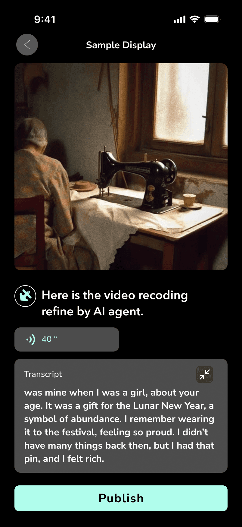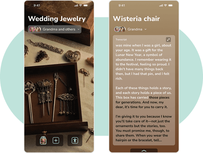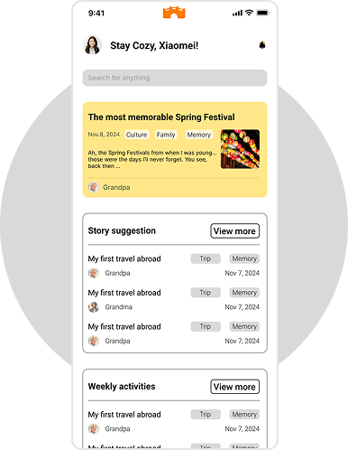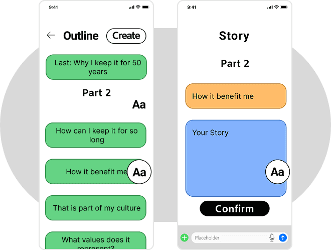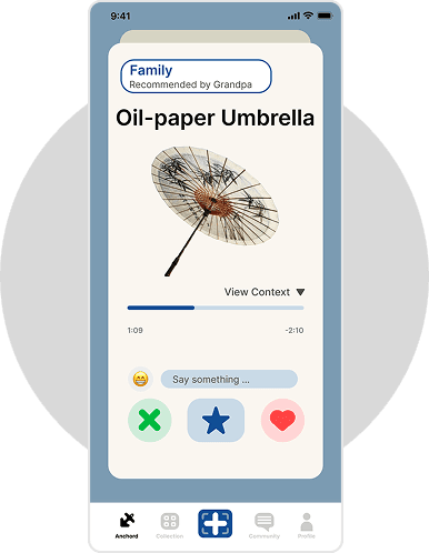 When I see an artifact, I naturally associate it with the story behind it; At the same time, stories with the voices of family members are more captivating than plain text. Therefore, we believe that storytelling with artifact-based cards and story listening should be used.