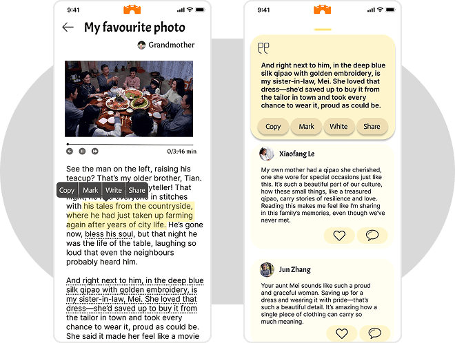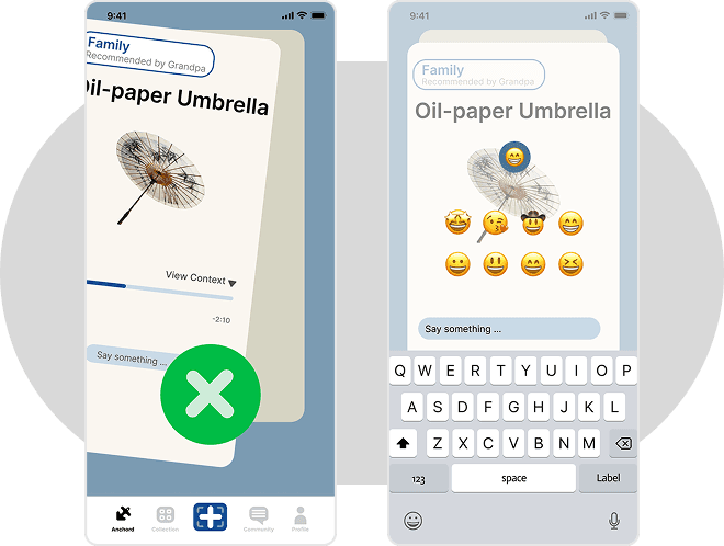 Another round of user testing tells us that although the storytelling is optimized, compared to plain text, there are still some issues: Scanning objects is an additional burden for the elderly; Tinder-style cards with too many social attribute functions weaken the storytelling feature itself. The barrier between young and the old generation is lower but still exists.